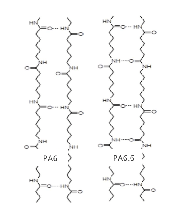 PA6由己內(nèi)酰胺開環(huán)再聚合,PA66由己二胺和己二酸聚合而成。二者分子鏈中都含有如下的酰胺基團結(jié)構(gòu):